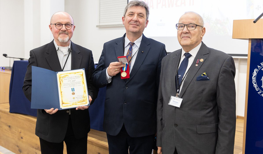 Odznaczenie odebrali id Prezesa+ Stowarzyszenia Pamięć ZJP II Ryszarda Zawadowskiego Panowie :Rektor Akademii prof. Paweł Skrzydlewski oraz Prorektor prof. Ryszard Skrzyniarz w Seminarium naukowego pośw. XX. rocznicy śmierci naszego papieża.