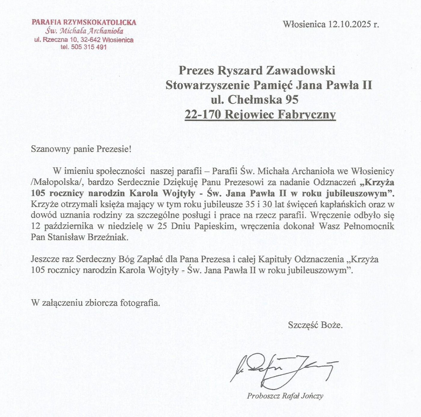 W imieniu społeczności naszej parafii – Parafii Św. Michała Archanioła we Włosienicy /Małopolska/, bardzo Serdecznie Dziękuję Panu Prezesowi za nadanie Odznaczeń "Krzyża 105 rocznicy narodzin Karola Wojtyły - Św. Jana Pawła II w roku jubileuszowym". Krzyże otrzymali księża mający w tym roku jubileusze 35 i 30 lat święceń kapłańskich oraz w dowód uznania rodziny za szczególne posługi i prace na rzecz parafii. Wręczenie odbyło się 12 października w niedzielę w 25 Dniu Papieskim, wręczenia dokonał Wasz Pełnomocnik Pan Stanisław Brzeźniak.