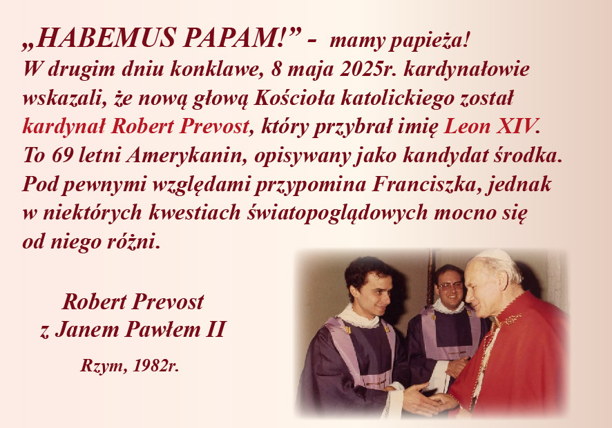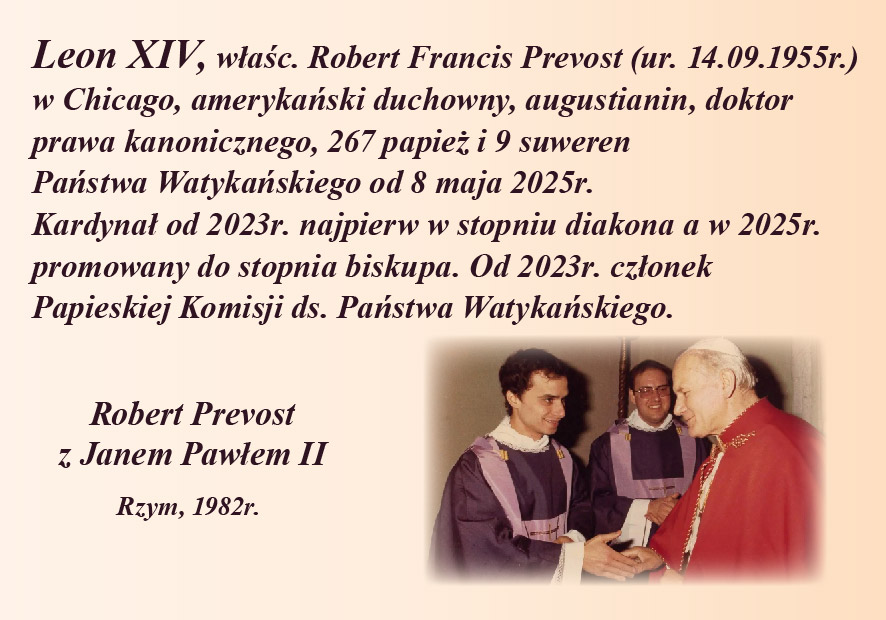 08.V.2025r. – 69 letni kard. Robert Francis Prevost, to 267 i zarazem pierwszy papież augustianin pochodzący z Ameryki Północnej.urodził się 14 września 1955 r. w Chicago, w stanie Illinois.
