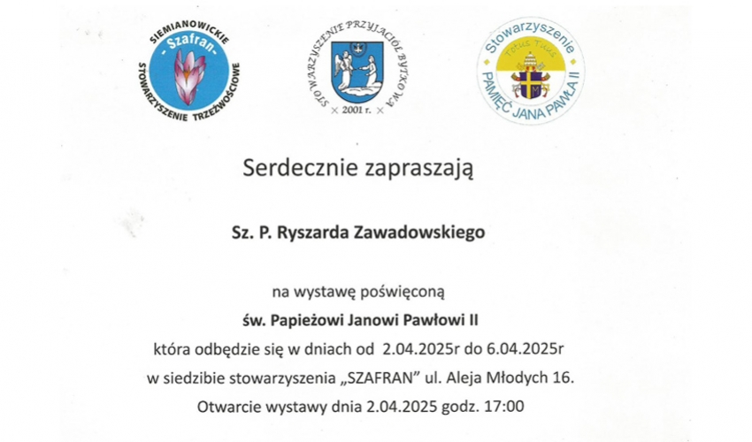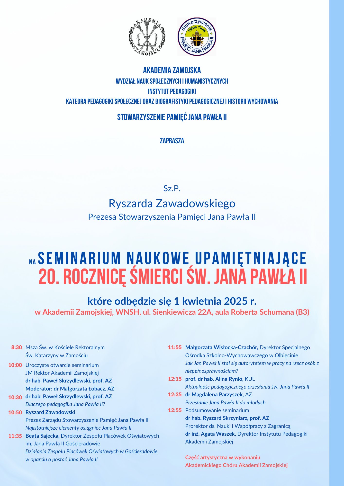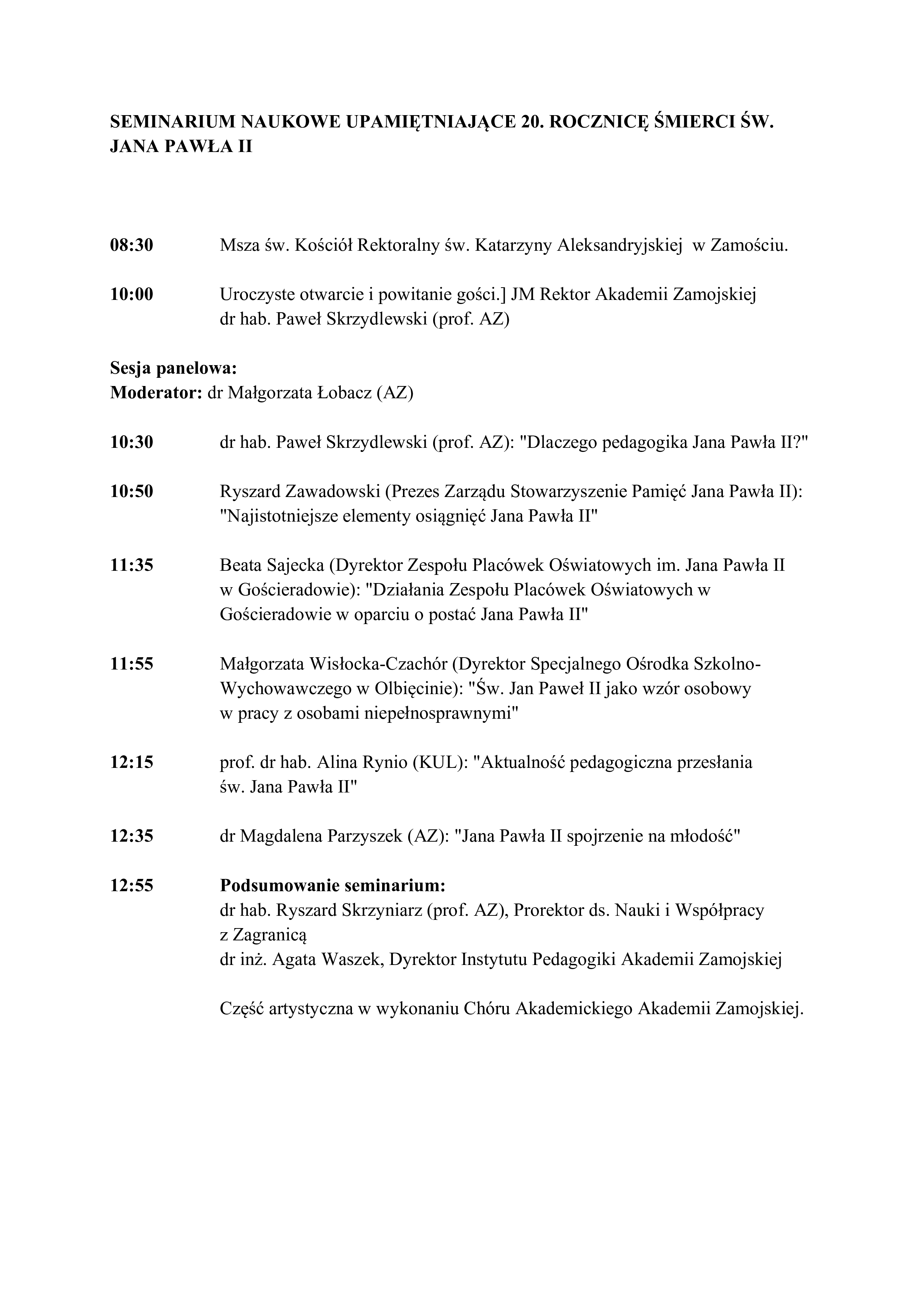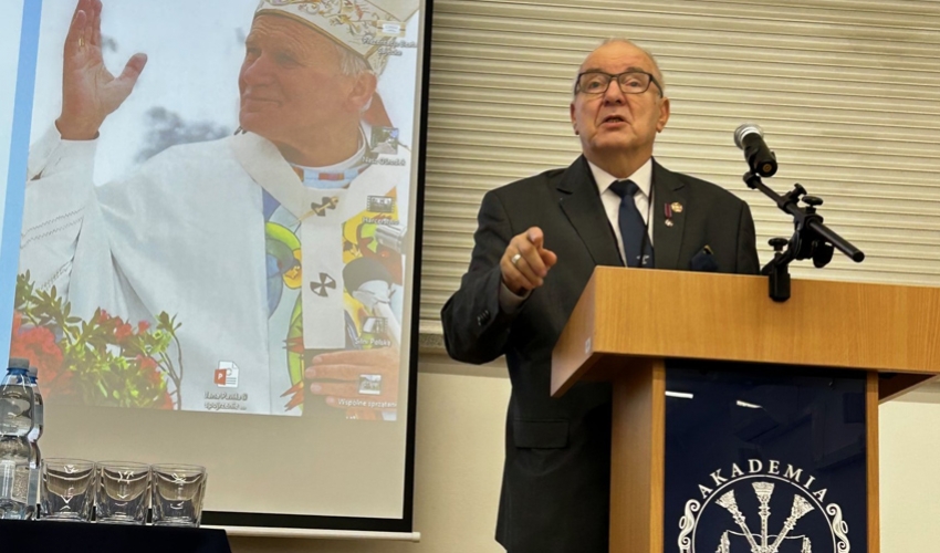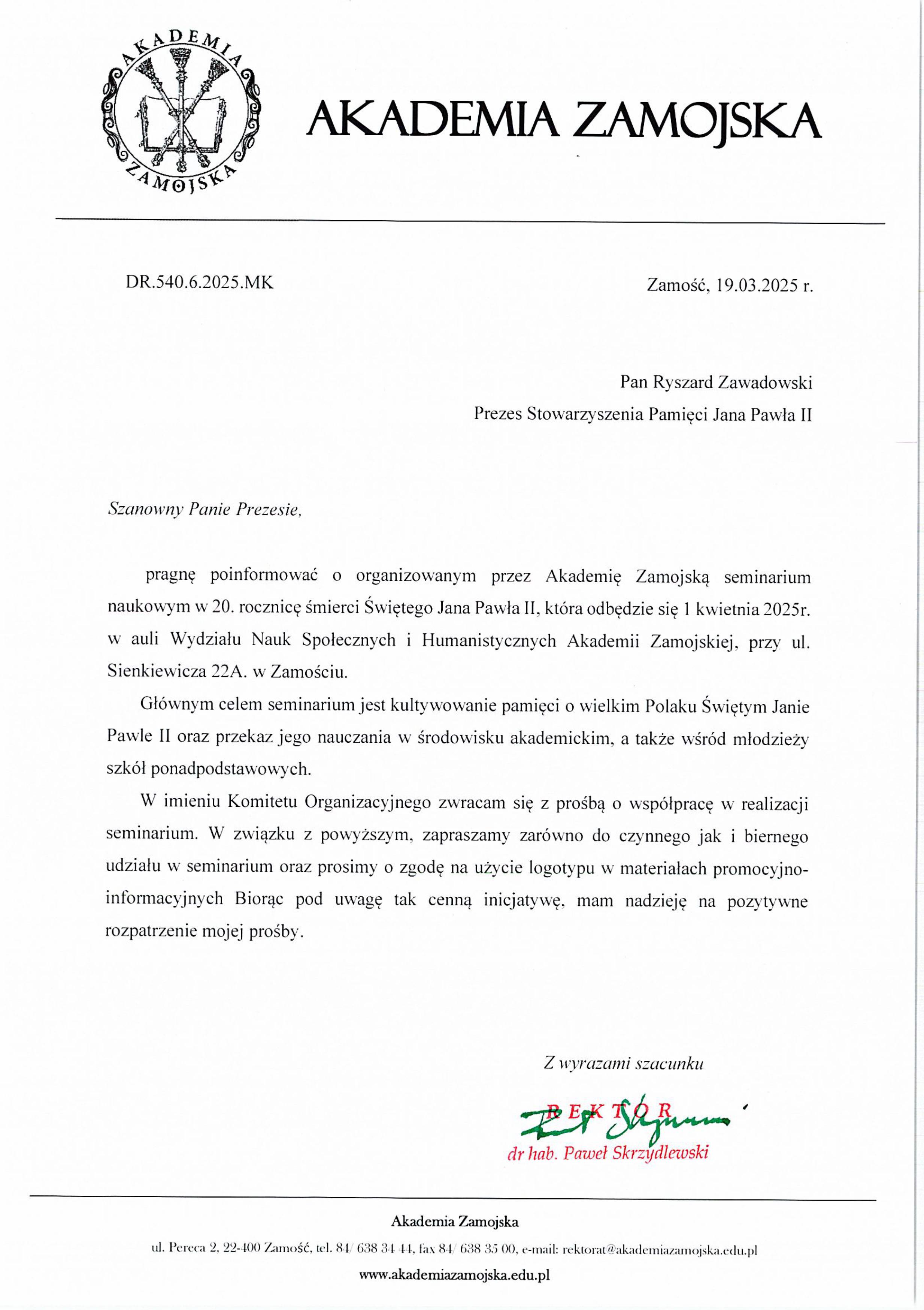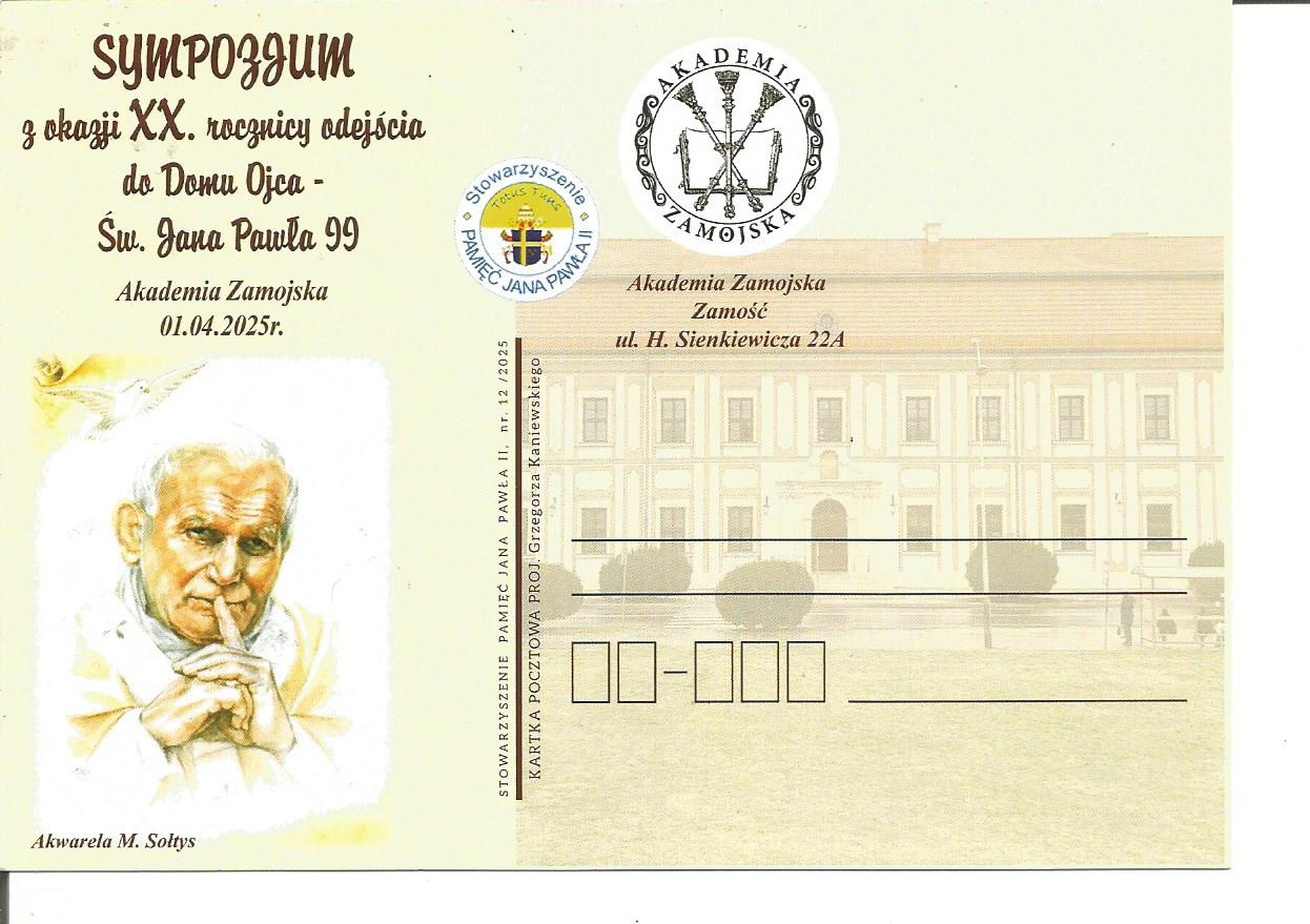 Z naszej inicjatywy Rektor Akademii Zamojskiej P. prof. Paweł Skrzydlewski i Prorektor P. prof. Ryszard Skrzyniarz przy wsparciu organizacyjnym mojego przyjaciela P. Wojciecha Adamczyka – Kanclerza Uczelni, podjęli inicjatywę uroczystego sympozjum poświęconego pontyfikatowi Św. Jana Pawła II (1978=2005). Wśród wykładowców będą, m.in. bardzo bliskie mi Panie P. mgr Beata Sajecka- Dyr. Zesp. Placówek Oświat. Im JPII ( „ Działania Zesp. Placówek Oświat. im. Jana Pawła II w Gościeradowie w oparciu o postać patrona”, P. mgr Małgorzata Wisłocka – Czachór Dyr. Specj. Ośrodka Szkolno - Wychowawczego im. kpt. lotnika inż. Jerzego Rudlickiego w Olbięcinie („ "Jak Jan Paweł II stał się autorytetem w pracy na rzecz osób z niepełnosprawnościami"). Mój głos to próba oceny wspaniałego pontyfikatu Wielkiego Papieża Polaka tym razem wzbogacone o praktyczne formy realizacji programu dydaktyczno-wychowawczego w placówkach oświatowych według Jego nauczania. Nie mogło zabraknąć Hymnu dla Jana Pawła II autorstwa Panów P. św. p. Romualda Lipko i autora tekstu P. Marka Dutkiewicza w wykonaniu uczennicy klasy Va Kamili Gałuszkiewicz ze szkoły papieskiej w Gościeradowie.. Specjalną okolicznościową kartkę pocztową zaprojektował i wydał Kol. Grzegorz Kaniewski z Gostynia – Wiceprezes Stowarzyszenia.