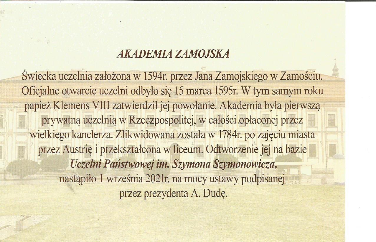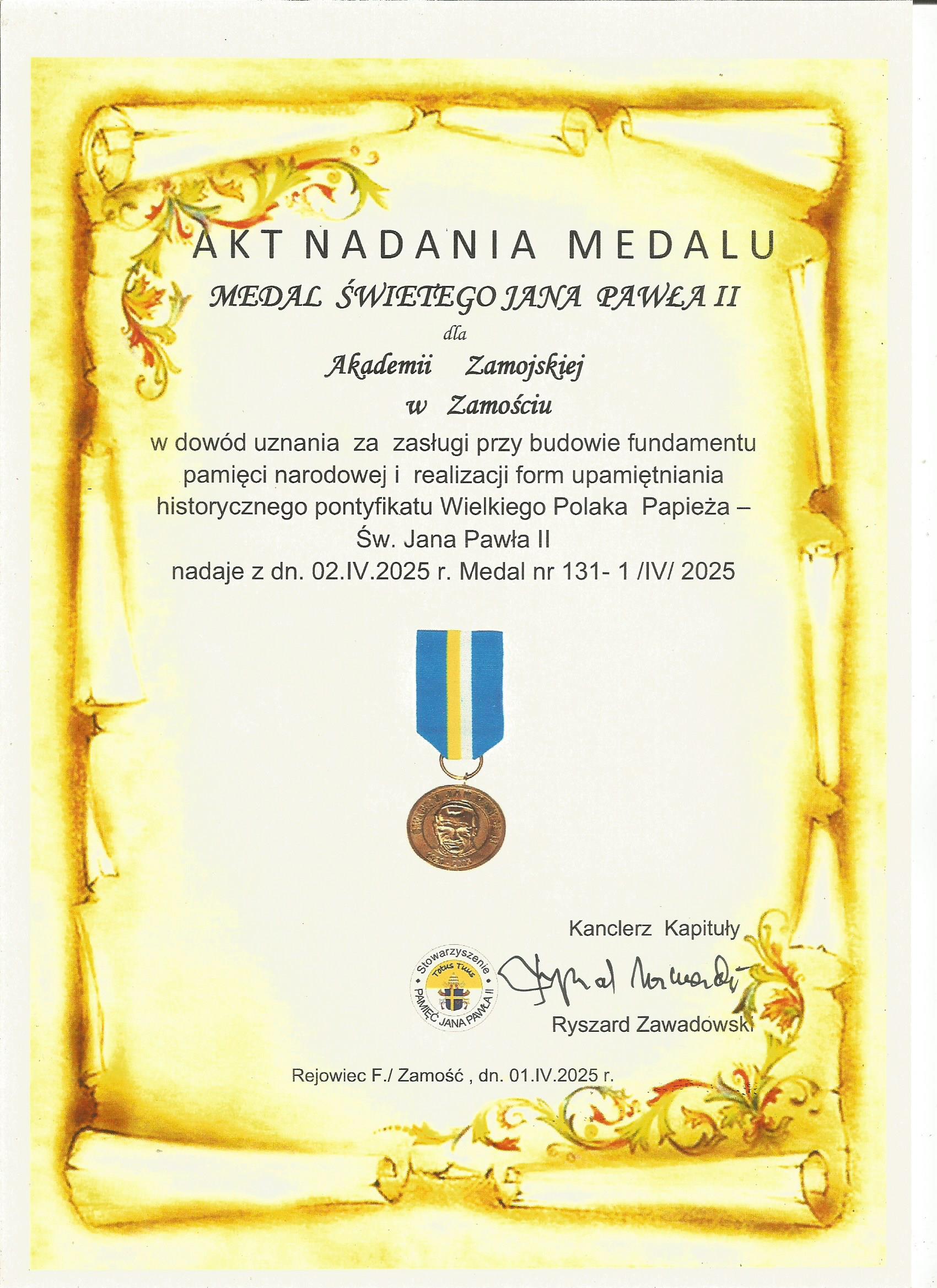 Uczelnia została zbiorowo odznaczona Medalem Św., P II a indywidualnie to odznaczenie otrzymał Rektor Akademii Zamojskiej.
