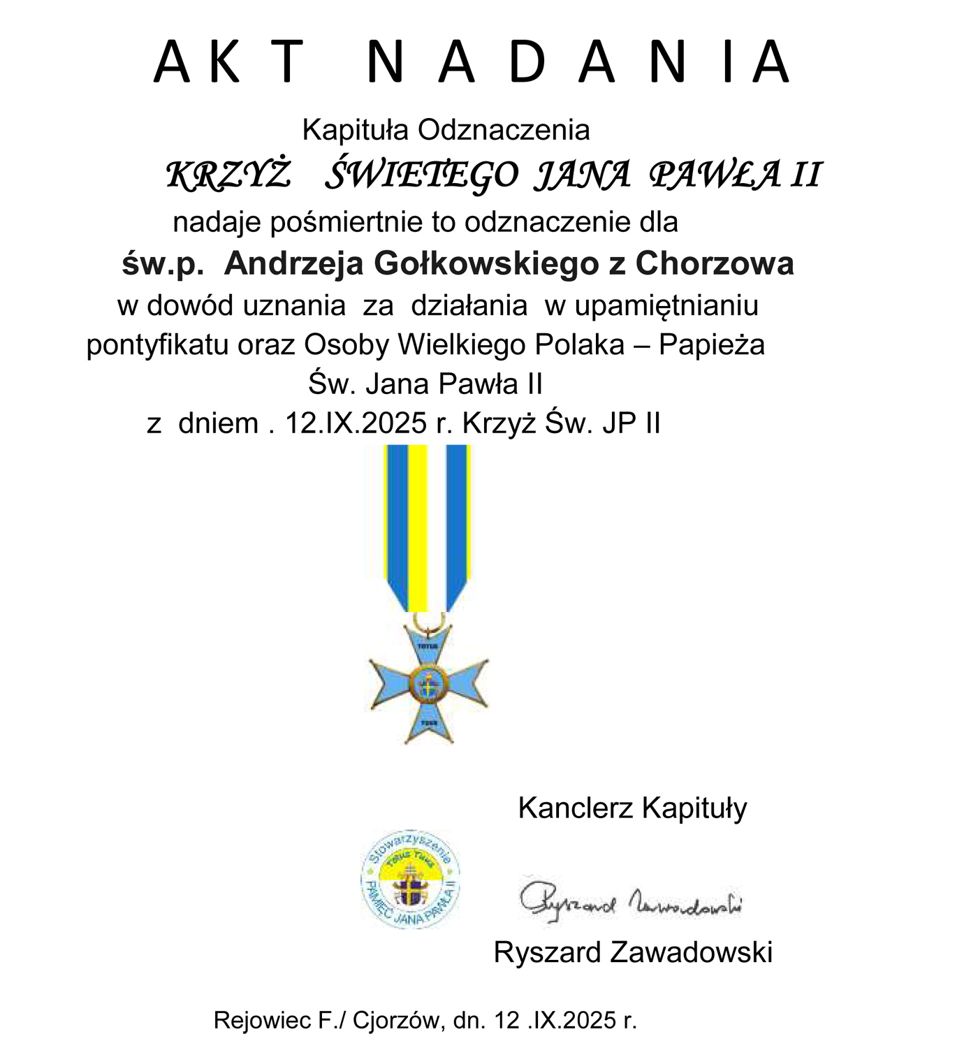 12.IX.2025r. odszedł do Domu Ojca pasjonat głównie filatelistyki, św.p. Andrzej Gołkowski z zawodu górnik. Po Nim pozostał przepiękny zbiór znaczków pocztowych zw. z Osobą Św. Jana Pawła II. Prawdopodobnie jest to kompletna kolekcja wydań znaczków pocztowych wszystkich państw i państewek z Afryki oraz emitowanych na pozostałych kontynentach świata. Jest ich w 14. dużych klaserach po nad 2.tyś. eksponatów! Decyzja małżonki zmarłego filatelisty P. Mireli Gołkowskiej to nie tylko chęć zachowania o „tym dobrym człowieku” pamięci, ale i świadomość ratowania wieloletnich starań Jej męża o zachowanie zbioru w całości.